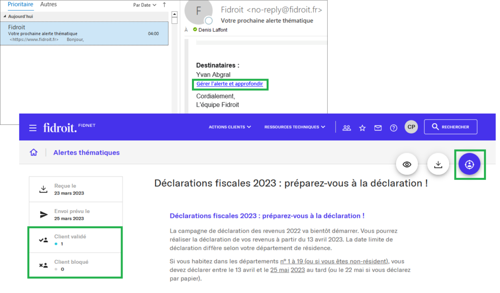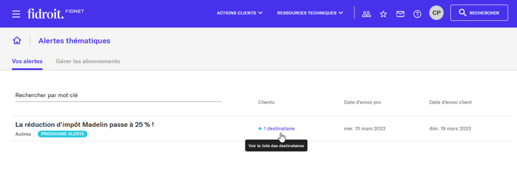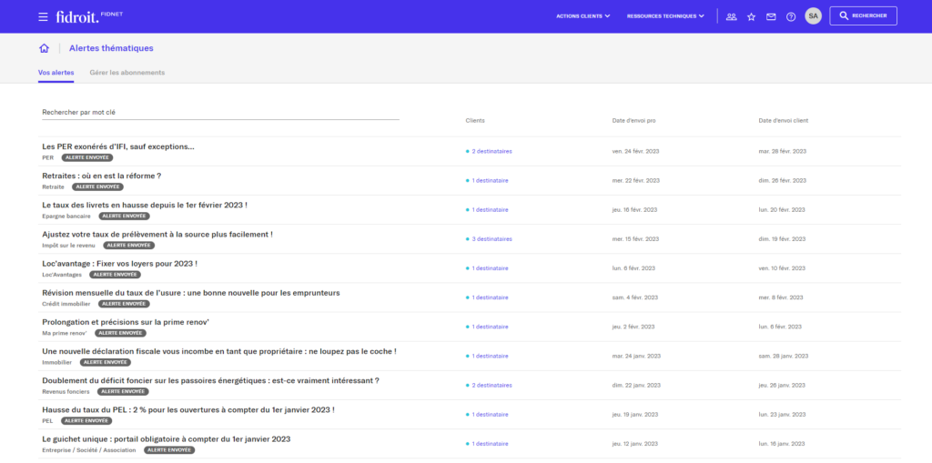 Dans votre Accueil de Fidnet, cliquez sur Alertes thématiques dans Mes actions clients.