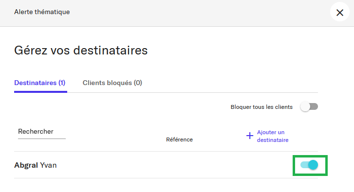 …de bloquer l’envoi en cliquant sur le bouton switch, si vous ne souhaitez pas que votre client la reçoive. Dans ce cas, le bouton switch passe à gauche, et votre client figure alors dans Clients bloqués.