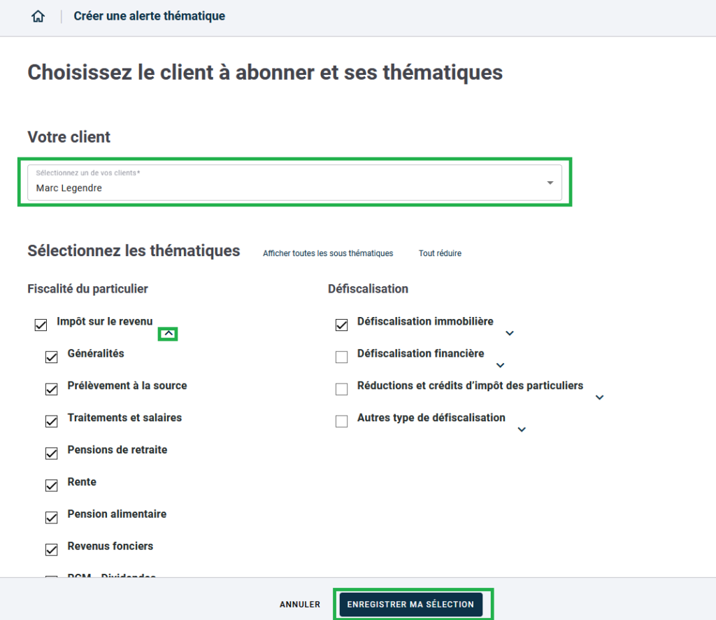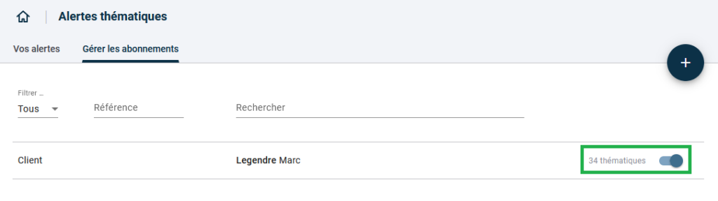 à droite du client pour lequel vous souhaitez gérer les abonnements, puis sur Gérer les alertes thématiques.