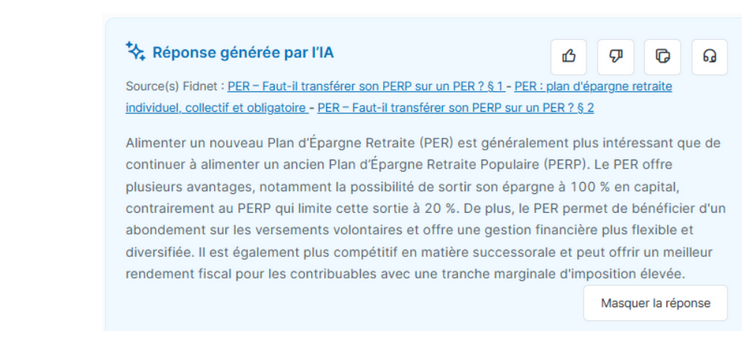 Vous vous demandez s’il est plus intéressant d’alimenter un ancien PERP ou un nouveau PER ? Avec Fidnet, obtenir une réponse claire et synthétique n’a jamais été aussi simple grâce à la recherche par IA.