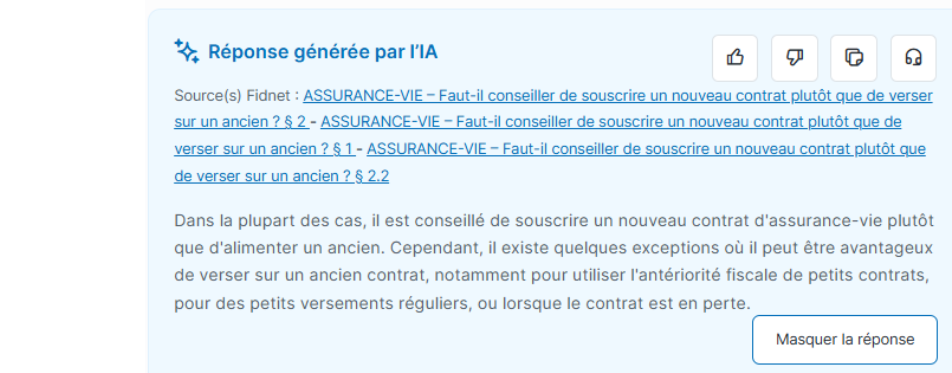 - Saisissez votre question en langage naturel, par exemple : Est-ce qu’il vaut mieux alimenter un ancien contrat d’assurance vie ou ouvrir un nouveau contrat ? La Recherche avec l’IA ne se limite pas à restituer le contenu de Fidnet : elle analyse votre question, parcourt les ressources Fidnet et vous fournit une réponse précise et pertinente.