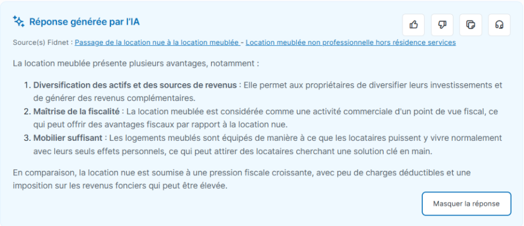 - Saisissez votre question en langage naturel, par exemple : Pourquoi faire de la location meublée ? La Recherche avec l’IA ne se limite pas à restituer le contenu de Fidnet : elle analyse votre question, parcourt les ressources Fidnet et vous fournit une réponse précise et pertinente.