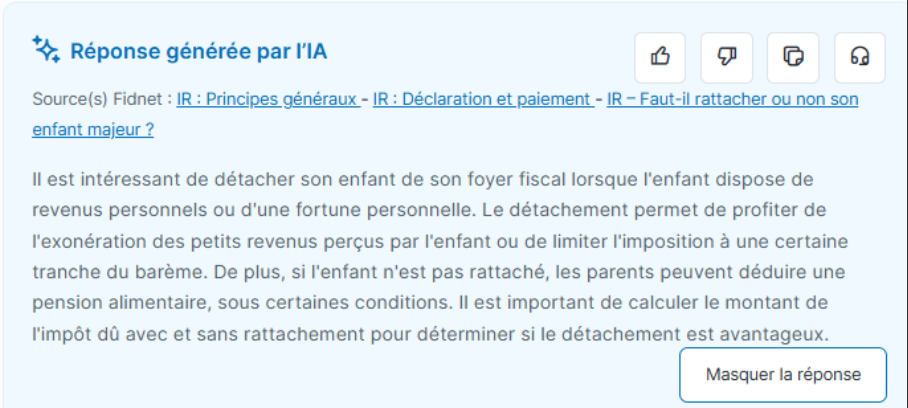 - Saisissez votre question en langage naturel, par exemple : Dans quel cas est-il intéressant de détacher son enfant de son foyer fiscal ? La Recherche avec l’IA ne se limite pas à restituer le contenu de Fidnet : elle analyse votre question, parcourt les ressources Fidnet et vous fournit une réponse précise et pertinente.